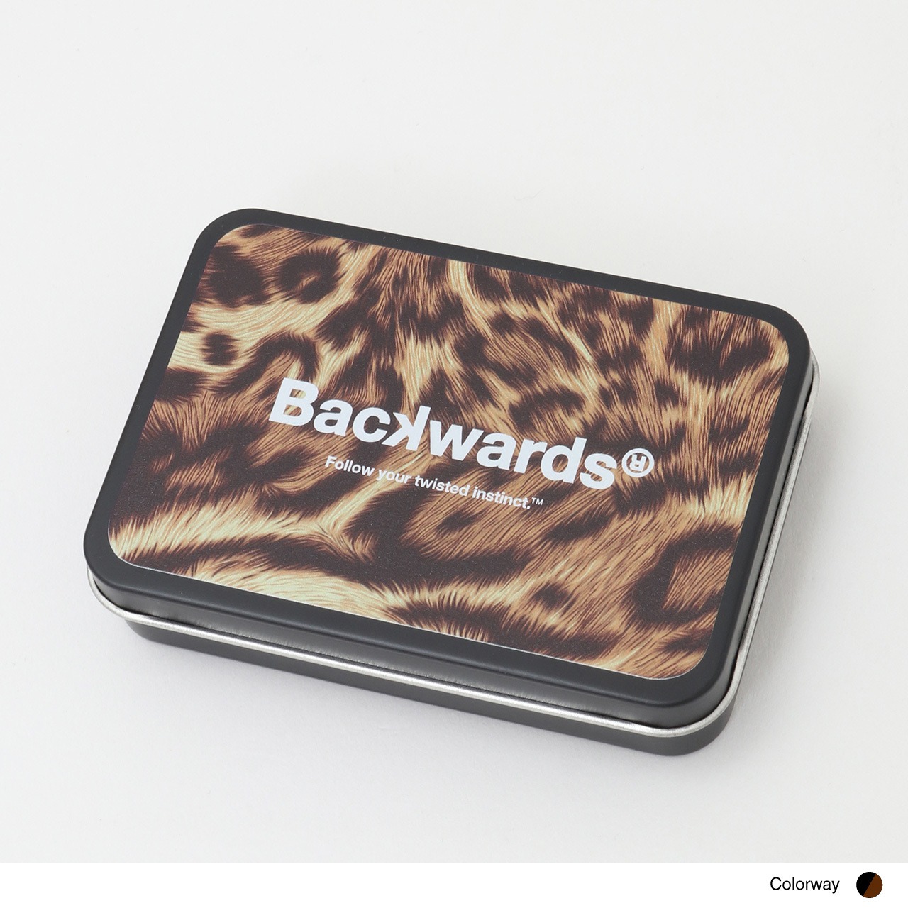 ブランドのアイコンでもある、レオパード柄の缶ケースに、Backwardsのロゴ入りのブラックベースウッドティーをセット。