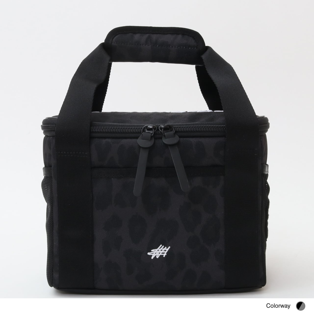 ブランドの象徴的なブラックレオパードパターンをプリントしたクーラーバッグ。サイドポケットにはスコアカード、スマートフォンなどが収納可能となっています。耐久性・防水性に優れ、環境に優しいPEVAを内装に使用。蓋の裏面に保冷剤が入る内ポケット(メッシュ)付きです。
