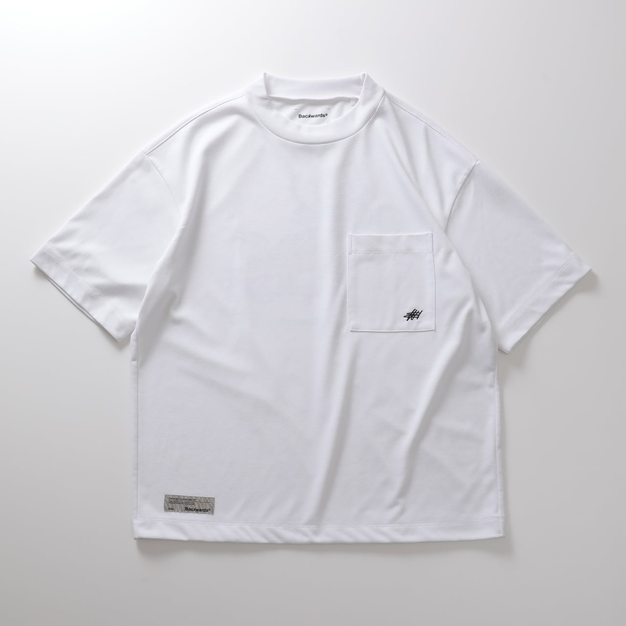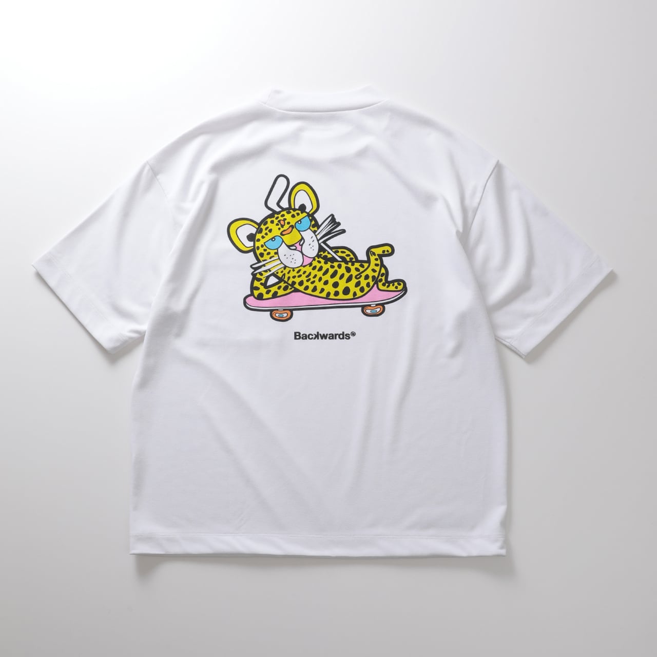 レイジーに寝そべるBackwardsのアイコニックなキャラクター「Cheeth」の染み込みプリントと、フロント刺繍を組み合わせたデザインに、スイングを妨げないリラックスフィットを掛け合わせた、Backwardsを象徴する一枚。