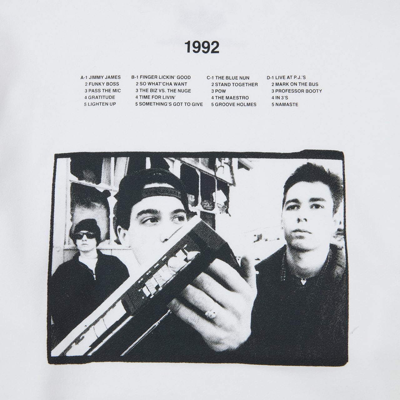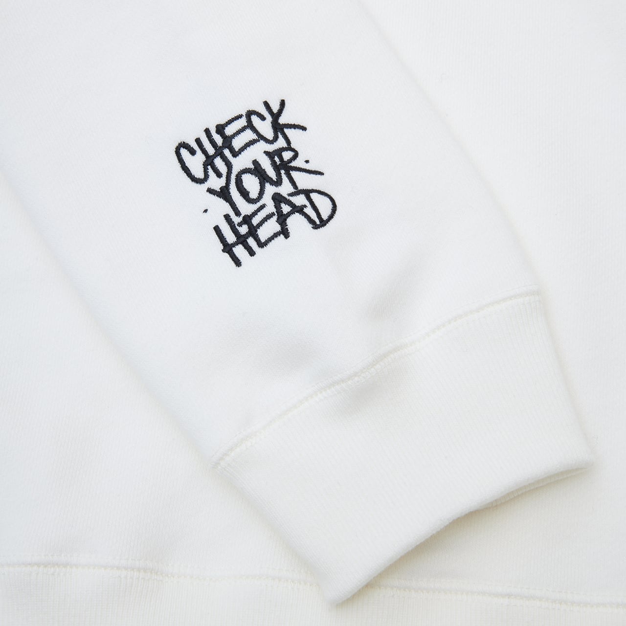 顔料とラバーの分量を緻密に調整し、古着のような独特の掠れた風合いを再現。フロントにはブランド定番のステイトメントロゴプリントを配しつつ、バンドの象徴的なグラフィックを随所にセット。袖にはEric Hazeによるアルバムタイトルのグラフィティを刺繍。バックには、メンバーのポートレイトとCheck Your Headの2LP版セットリストをグラフィカルにプリント。