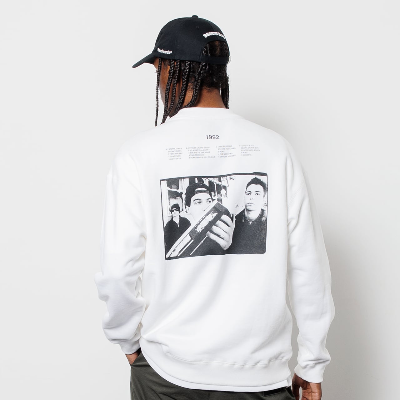 多くの支持を集めたBackwards × Beastie Boysのコラボクルースウェットが、同デザイン・同仕様で再登場。Eric Hazeによるグラフィティ刺繍や、Check Your Headの2LPセットリストを背面にプリント。希少なヴィンテージ裏毛が生む、古着のような掠れ感と柔らかな膨らみ。3シーズン快適に着用できる一着です。