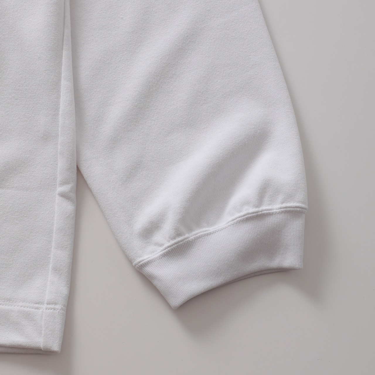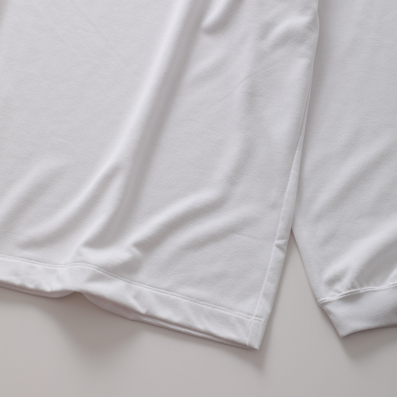 ・ポリエステル100%ながら、まるでコットンのようなナチュラルな肌触りと風合いを実現。カジュアルな太番手でドライな質感があり、度詰めに編み立てる事で適度な厚みとしっかりした手持ち感、透けにくさを付与。