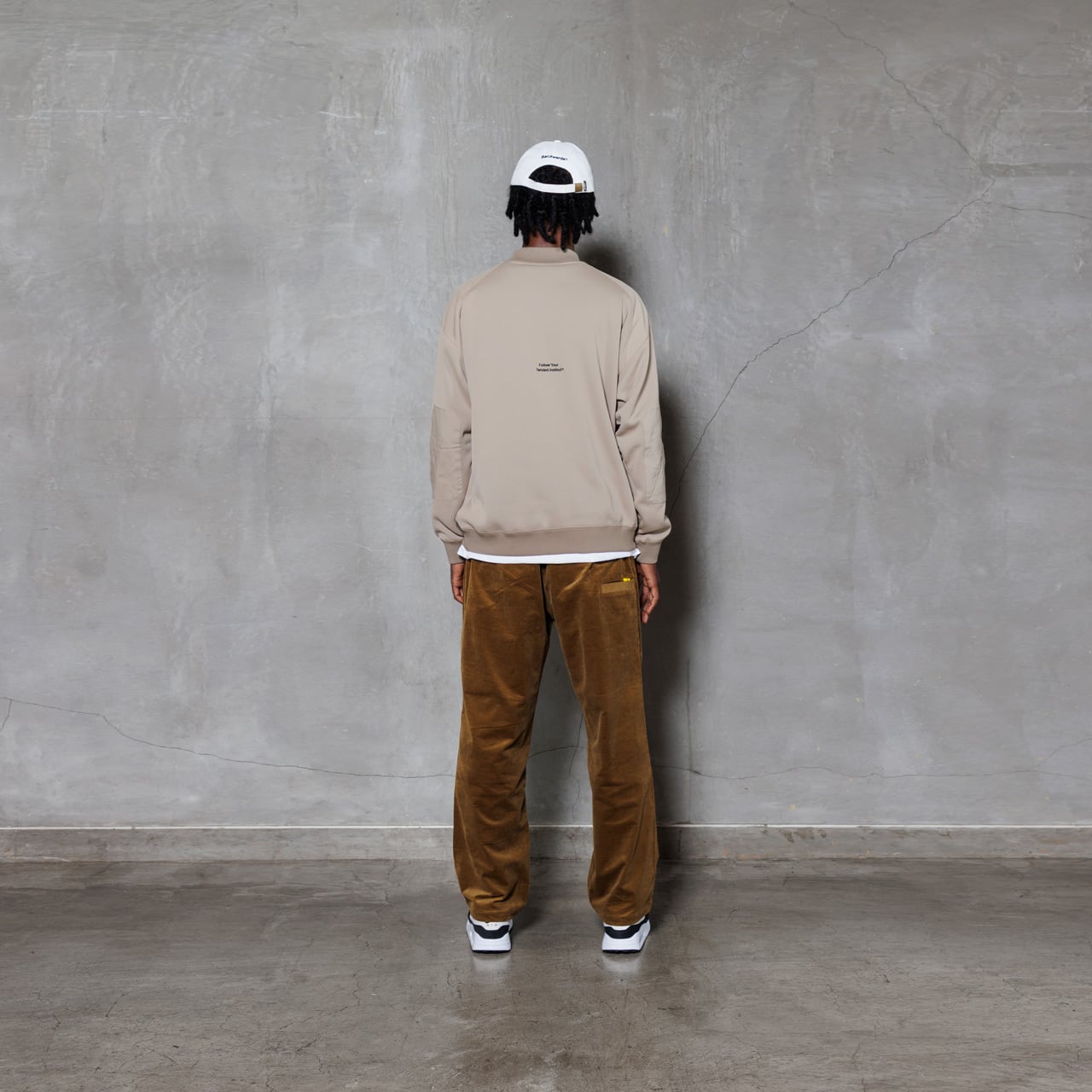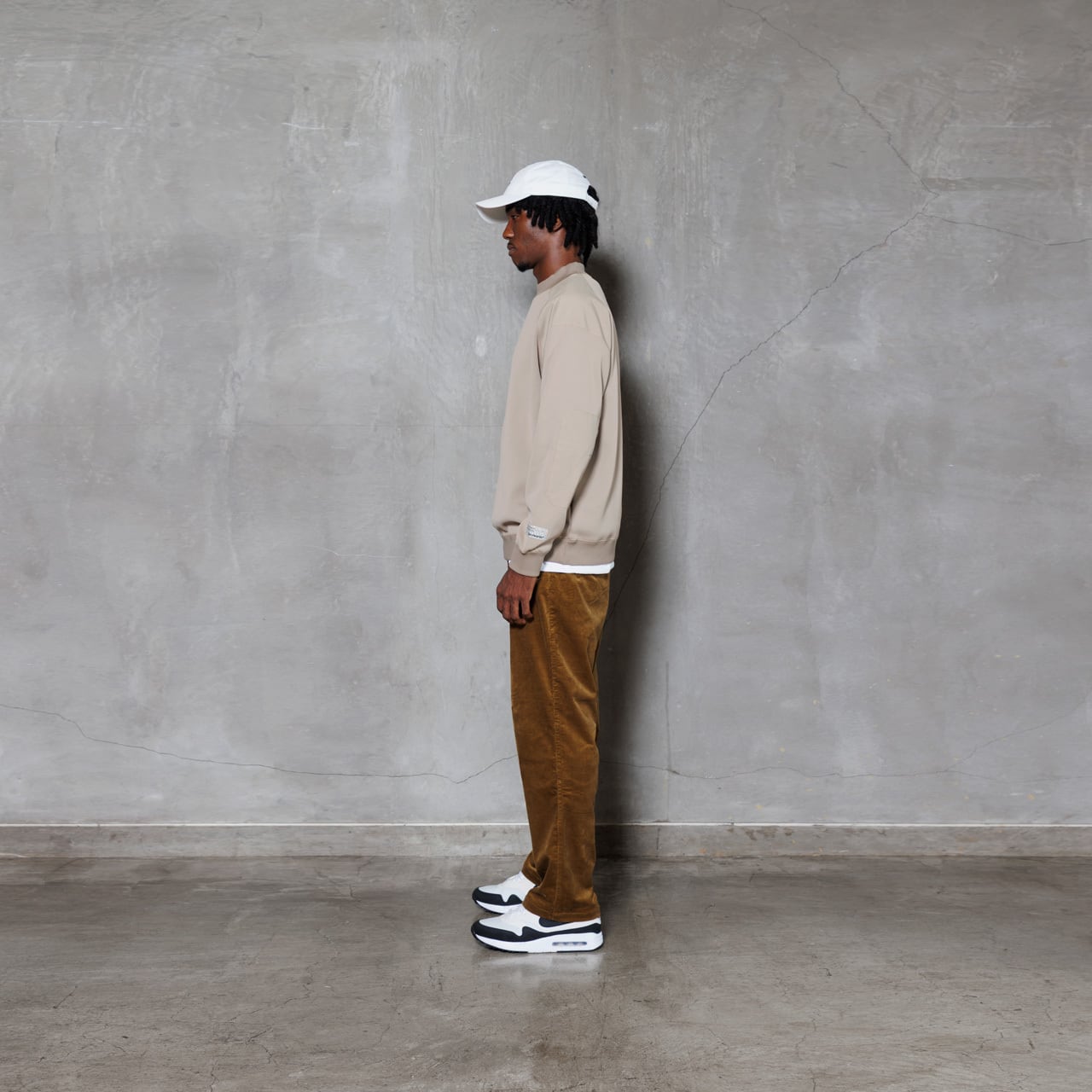 ・だらしなくならない程良いオーバーサイズシルエットを追求し、身巾/肩巾にゆとりをもたせつつプレイを考えた長すぎない着丈と袖丈がポイント。