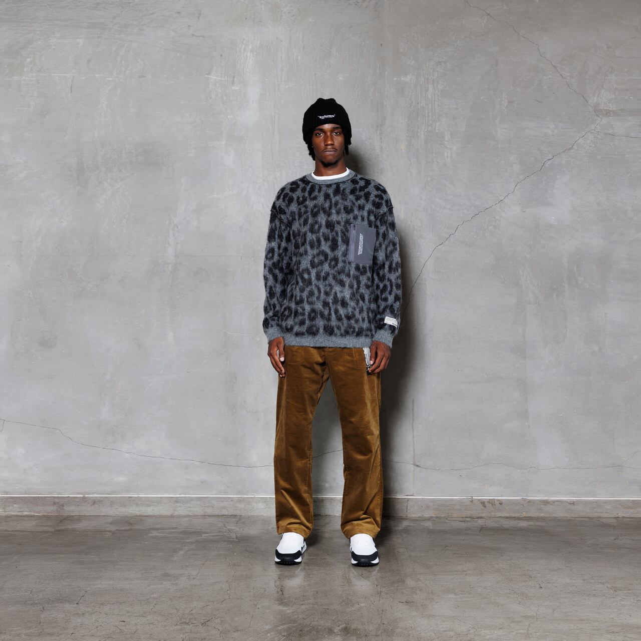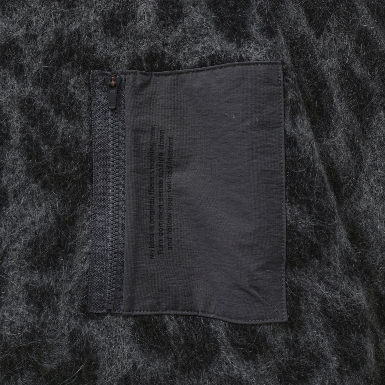 ・左胸にはウーブンファブリックのZIPポケットを配置。ニットアイテムにユーティリティ要素を加えています。シンプルな印象のブラックにはレオパードファスナーがポイントになっています。