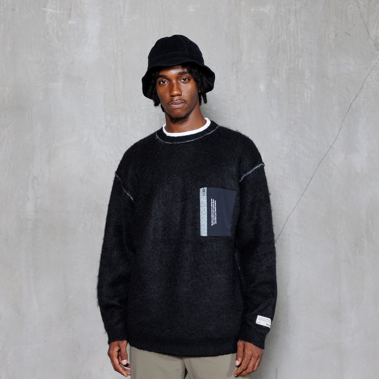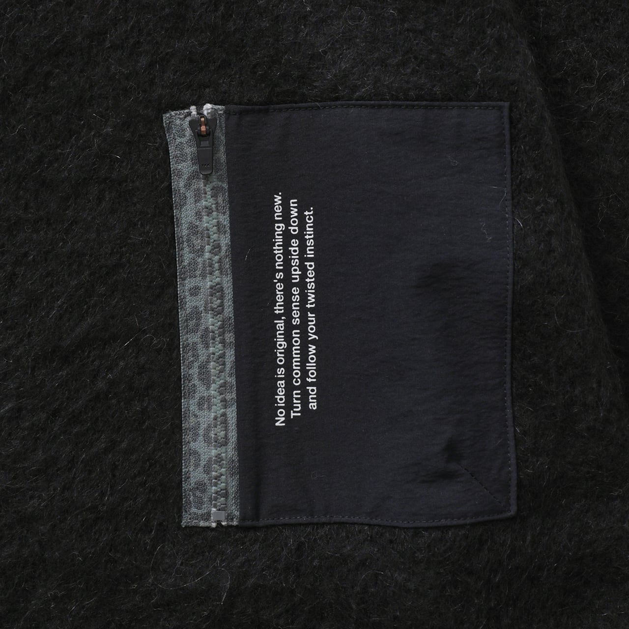 ・左胸にはウーブンファブリックのZIPポケットを配置。ニットアイテムにユーティリティ要素を加えています。シンプルな印象のブラックにはレオパードファスナーがポイントになっています。