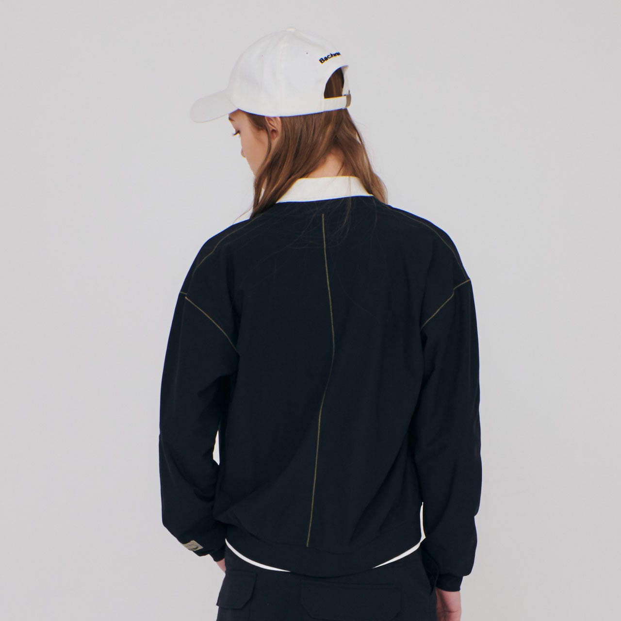 ・特殊ミシンによるカバリングステッチの配色が、シンプルなスタイリングのアクセントに。