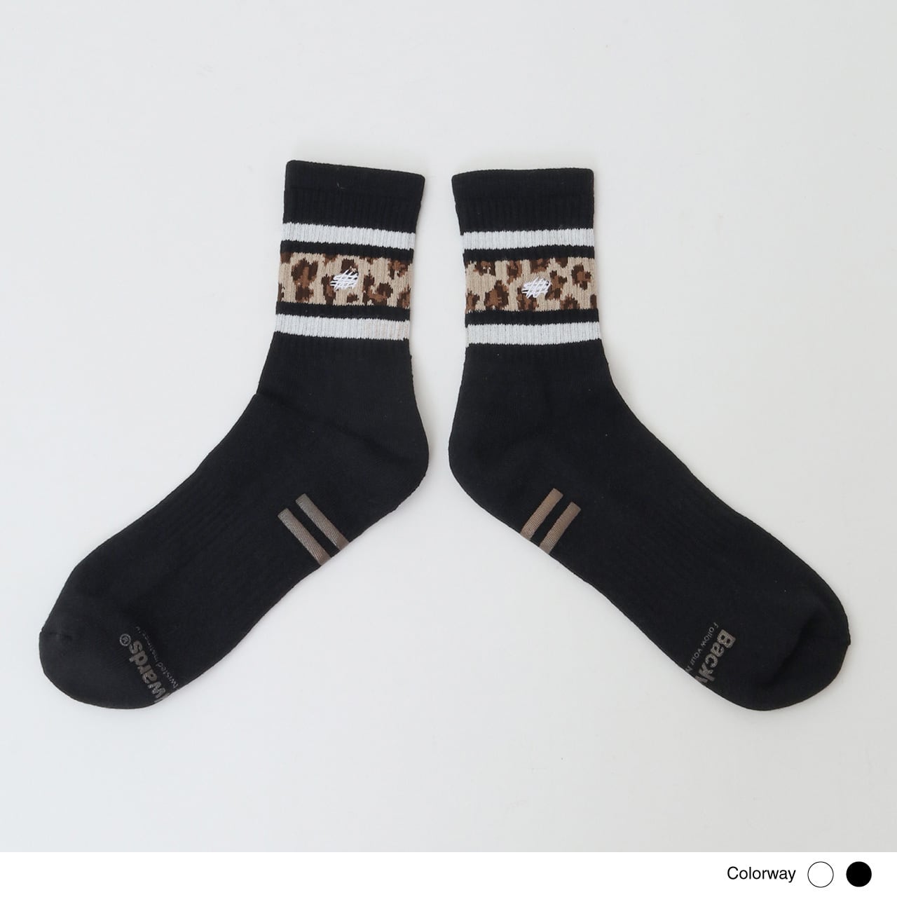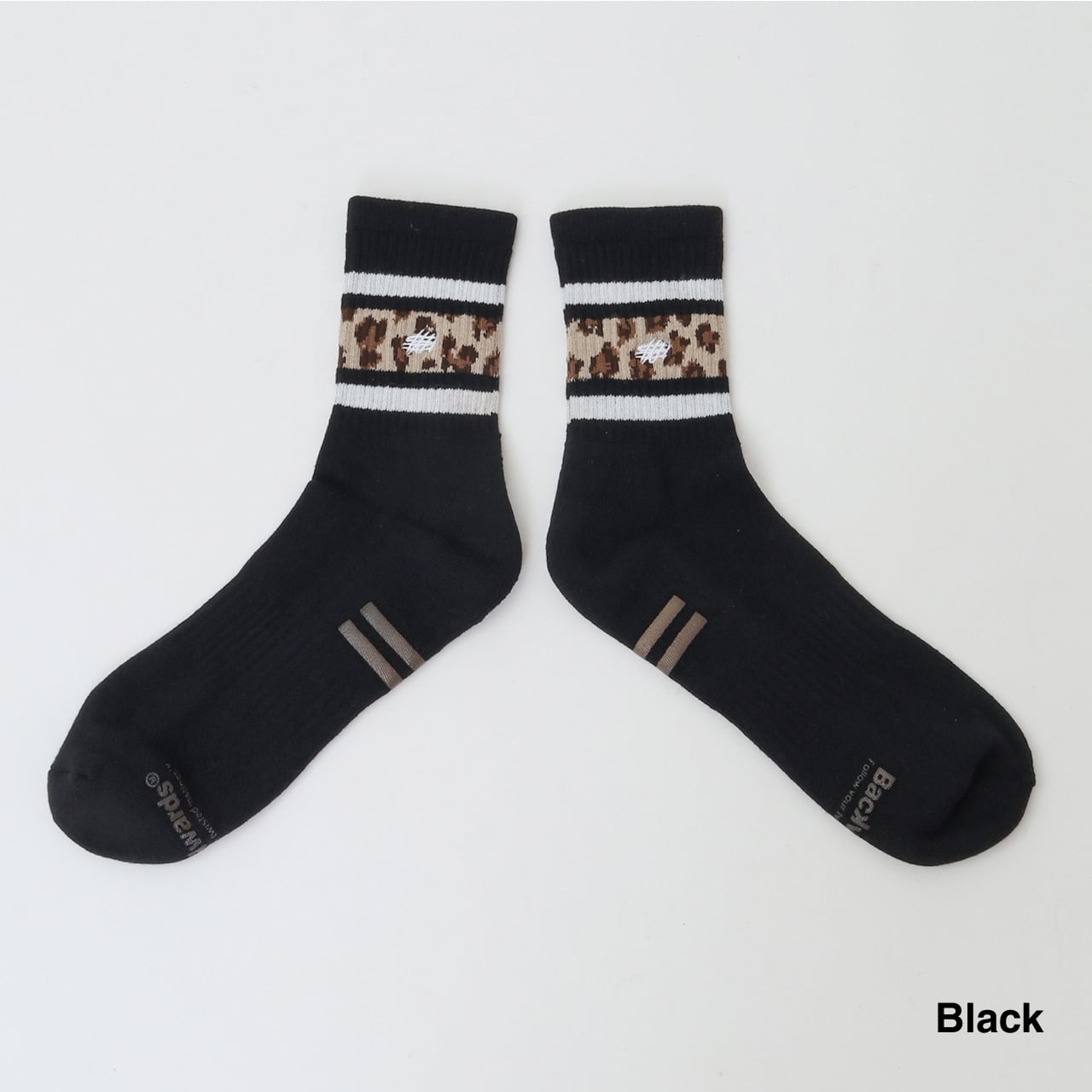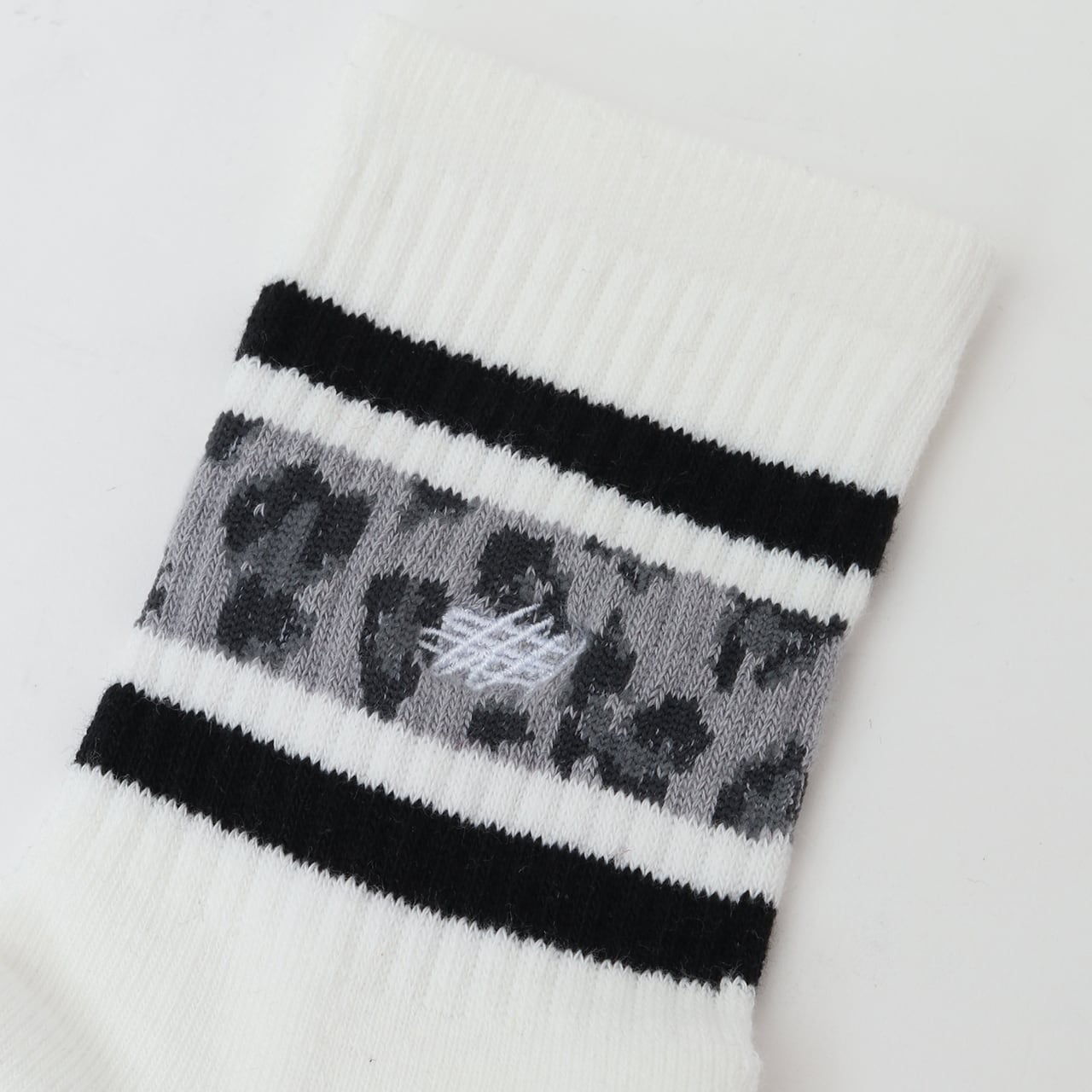 スケーターソックスの定番であるラインリブを、アイコニックなレオパード柄でアレンジ。中央にタギングスクリプトロゴをワンポイント刺繍しています。