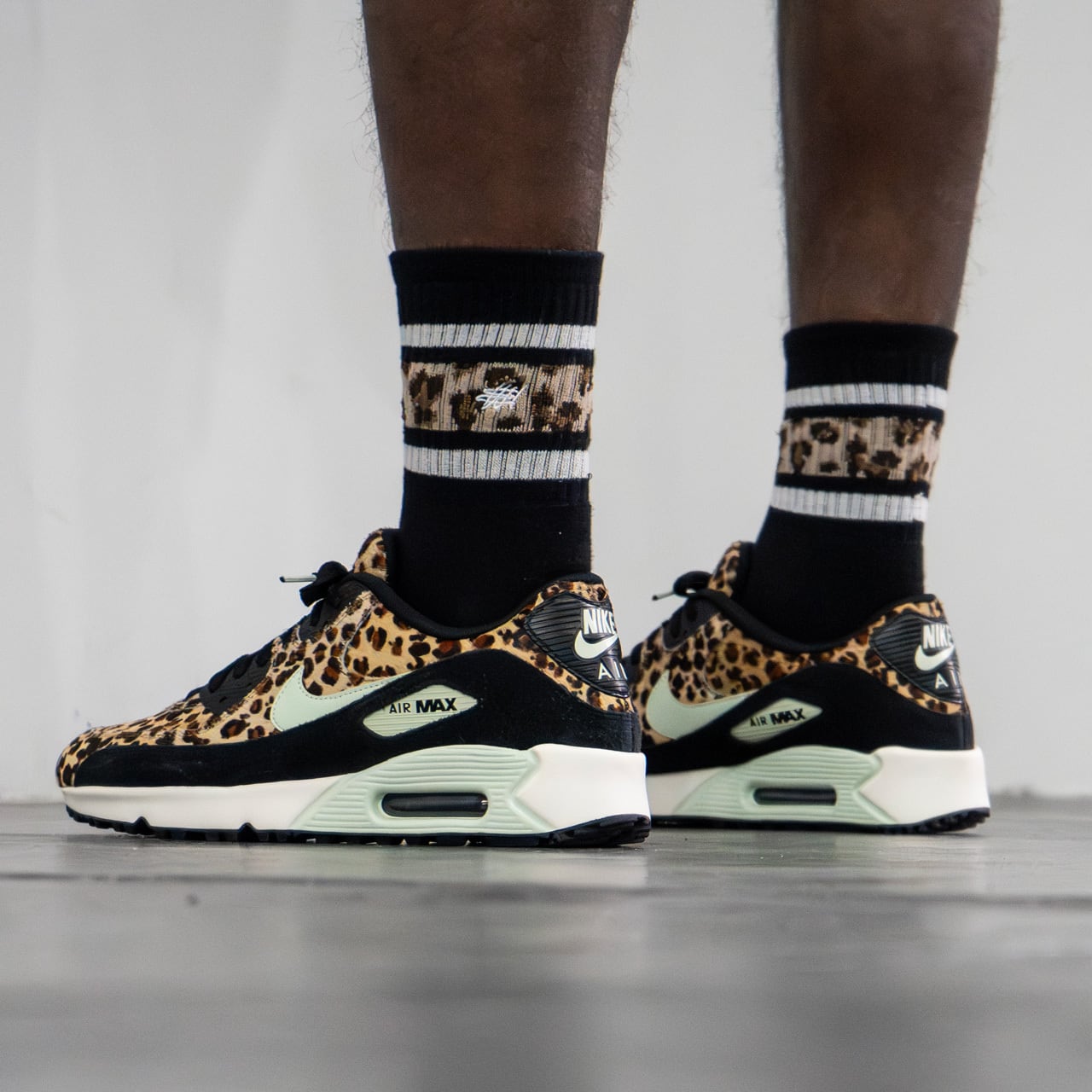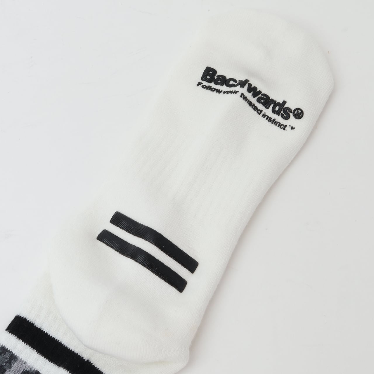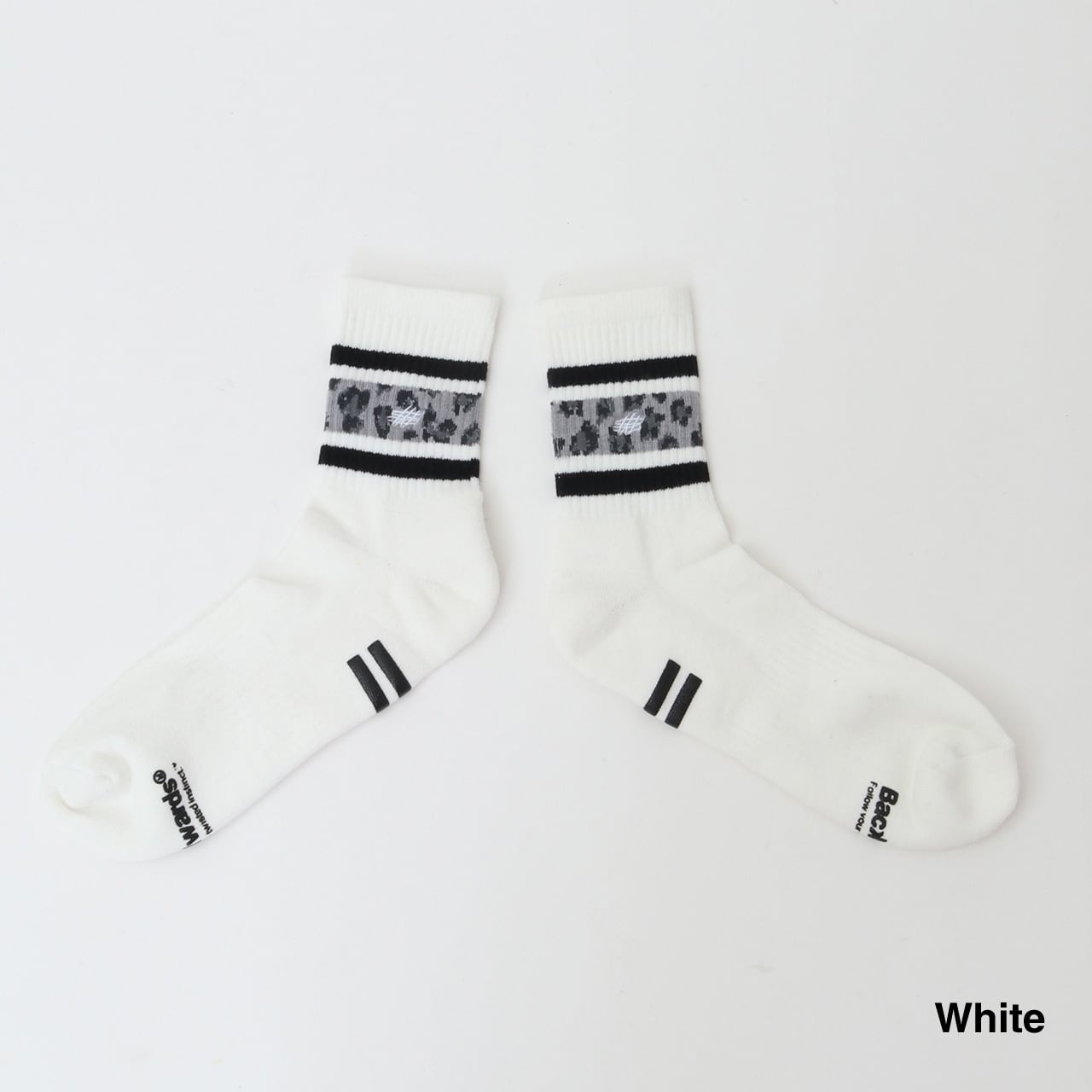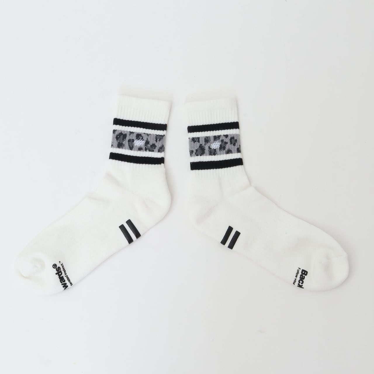 スケーターソックスの定番であるラインリブを、アイコニックなレオパード柄でアレンジ。中央にタギングスクリプトロゴをワンポイント刺繍しています。
