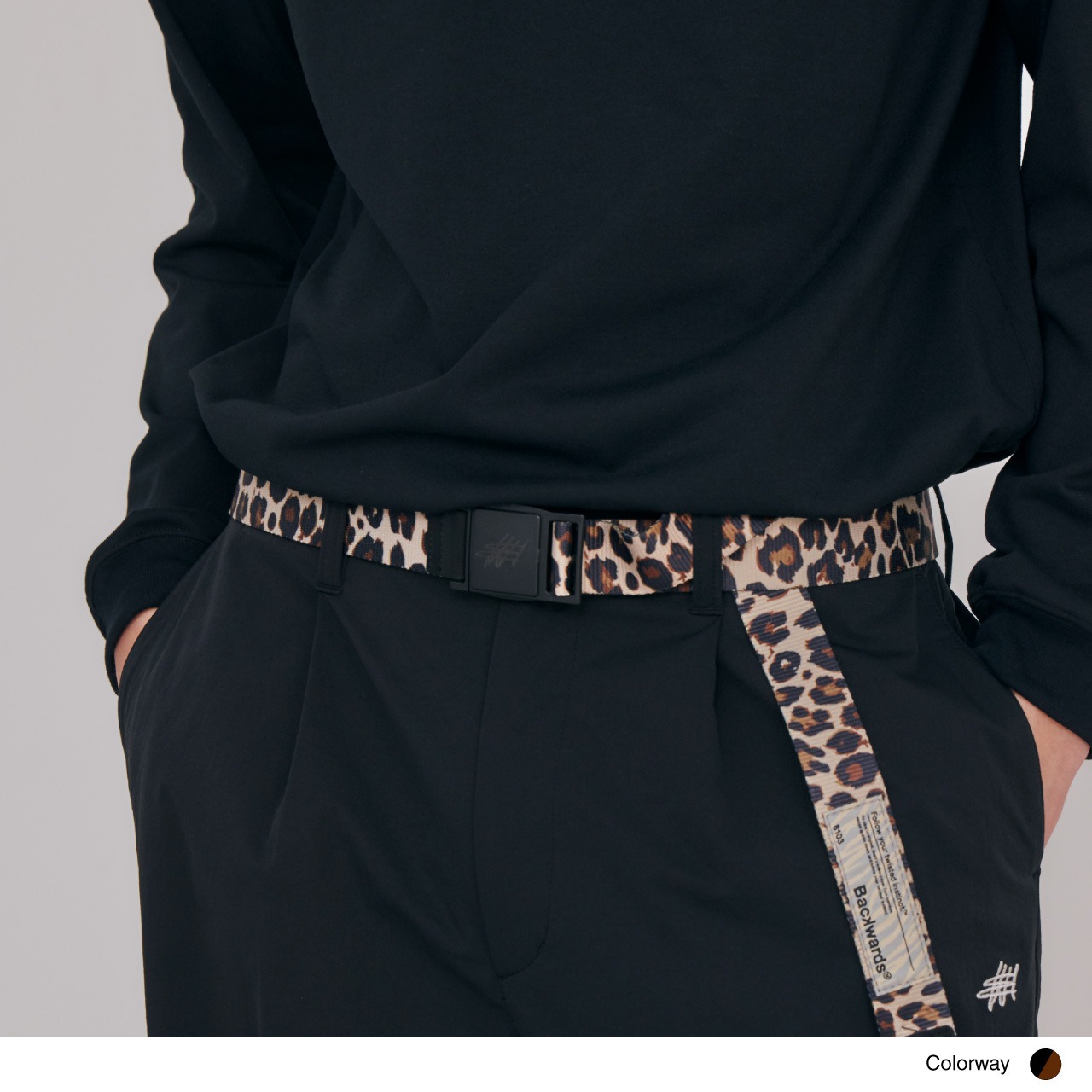 ソリッドなコーディネートにワンポイント使いでアニマルパターンが映えるテープベルト。